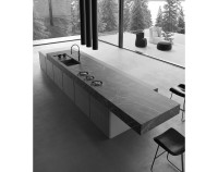 The kitchen finds its greatest expression in the island. Its spaciousness makes it appear majestic, and the overhanging top emphasises its architectural strength. The thick Dekton® top accommodates the integrated sink and Pitt Fire burners, and ends with the breakfast bar.