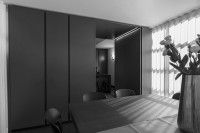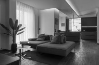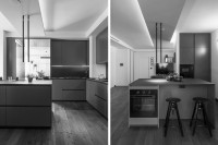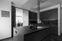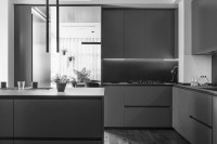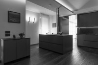 This "Ares" realization presents dark and exclusive finishes, for a timeless and sophisticated design. The "ocean" lacquered color gives depth and refinement to the environment. The island and the detached elements offer a functional and high-level culinary experience. The living tunnel completes the project.