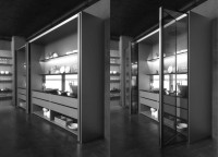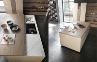El sistema de apertura del piso de la isla es una solución innovadora que ahorra espacio. La gran superficie se utiliza tanto como encimera como mesa de aperitivos. Los electrodomésticos y la bañera integrada en Dekton® quedan completamente ocultos.
