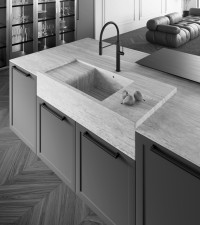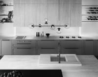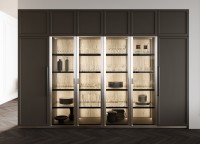 Los maxi armarios colgantes de altura completa enfatizan el espacio, aprovechando las capacidades. Las columnas de escaparate crean una escenografía luminosa en la que se inserta la isla central con el plano snack a ras de 45°. Las boiseries con repisas de cristal retráctiles completan la decoración.