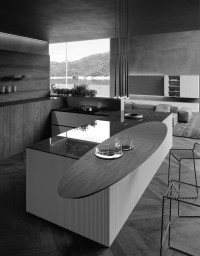 Las formas absolutas y los colores claros se calientan con los tonos de Nogal Canaletto, utilizados para el original apéndice snack pantografiado ovalado, colocado sobre la parte superior, con un corte de 45°.
