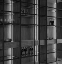 El acabado Nogal Canaletto enmarca las columnas iluminadas por LED antideslumbrantes integrados. La estructura de 2 cm de aluminio negro satinado, con tirador integrado, enmarca el cristal ahumado que se abre para dejar una vista completa de los cajones y estantes de cristal y aluminio.