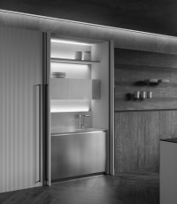 El espacio se organiza de manera óptima en las columnas Ghost equipadas, con accesorios multifuncionales retráctiles. Ghost es el innovador mecanismo de apertura y cierre de maxi puertas de toda altura que transforman el espacio de la cocina en una pared lineal.