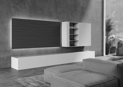 La base suspendida con compartimentos abiertos en lacado Milled se coloca junto al panel retroiluminado de Nogal Canaletto. Las cestas lacadas a juego crean el espacio de almacenamiento.