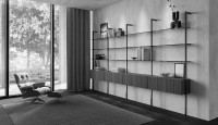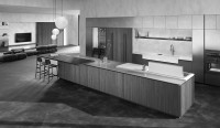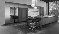 Le cœur de la cuisine est l’îlot central, synthèse de tout le projet. Le développement horizontal permet de contenir les tiroirs, les casseroliers et les électroménagers. Le plan en acier inox brossé épaisseur 0,8 mm allège l’aspect monumental et contient le Laminam bac évier intégré.