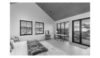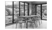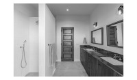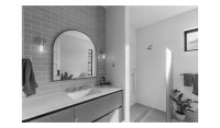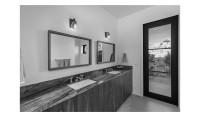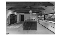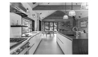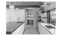 Project: Kitchen, Living, Bathroom Model: Sistema 84 - Ares Materials: Vetro lucido bianco 9003, Laccato lucido spazzolato poliestere grigio vaio, Yosemite Noce