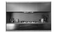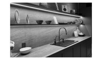 Projet : Cuisine, garde-manger Modèle : Système 84, Ares, Kea, Slim Matériaux : Acier fortement oxydé, Chêne teinté, Verre fumé, Cuisson à l'eau, Dossier en pierre